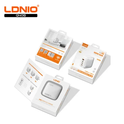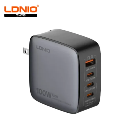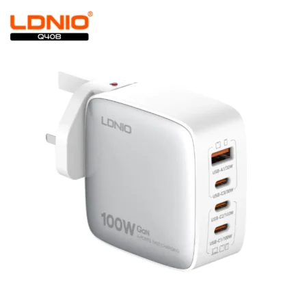 Super Fast 100W Gan Fast Travel Charger with 1 x USB A output, 3 x USB C outputs and changeable EU and UK prongs to charge multiple devices simultaneously.