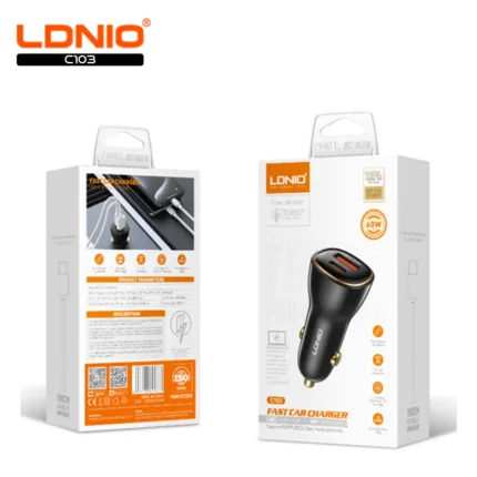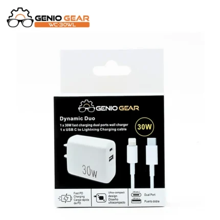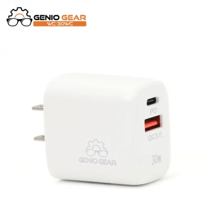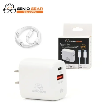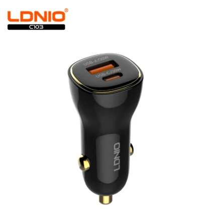 30W + 30W Fast In-Car Charger with 1 x USB A Output and 1 x USB Output. 1 x USB C to USB C Charging cable included to support fast charging. Color: Black Model: C103