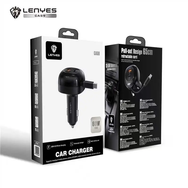 30W Fast In-Car Charger with 1 x USB A Output, 1 x USB Output and 1 x Retractable USB C cable output.