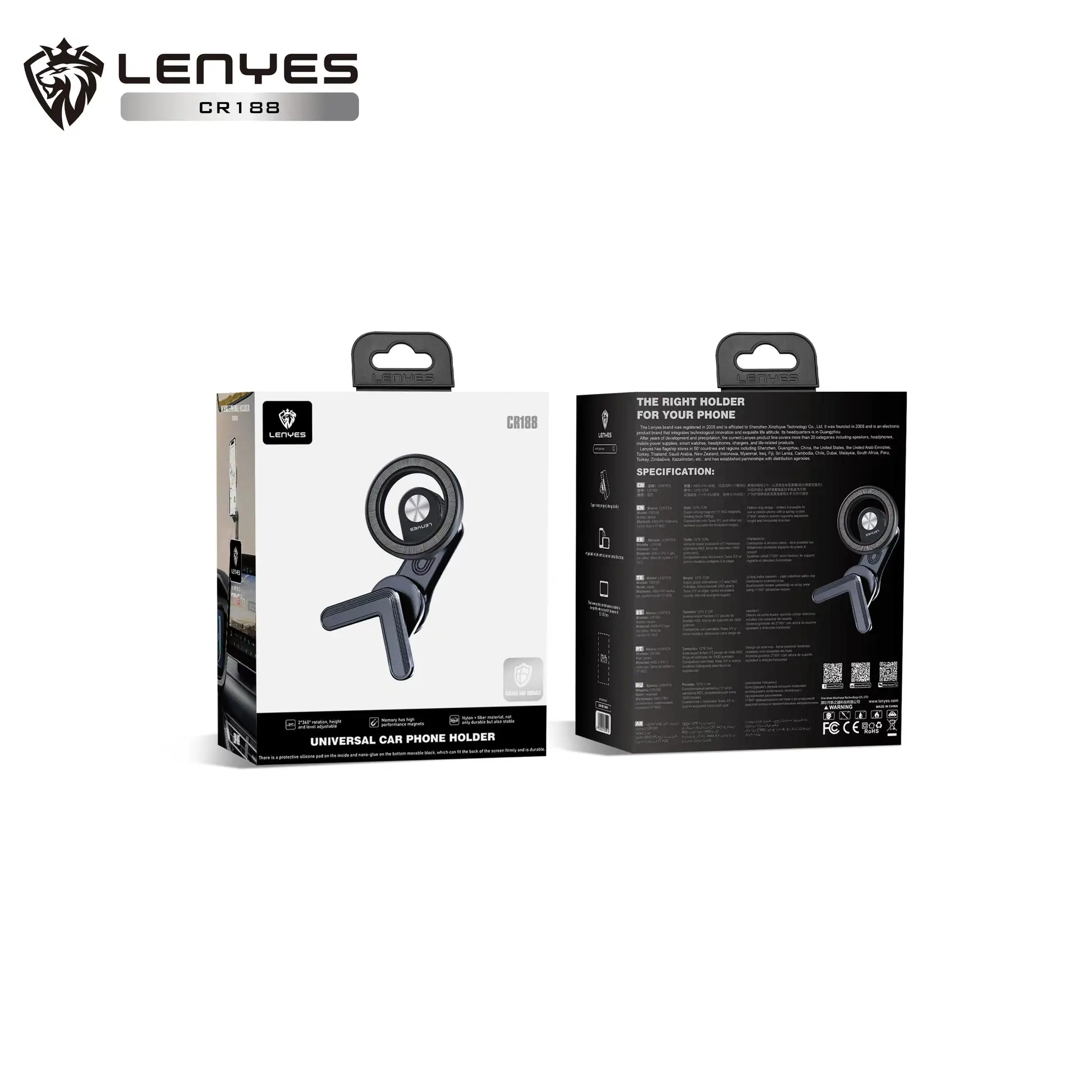 The Lenyes CR188 Universal Car Holder is designed to fit most smartphones. It features adjustable arms that hold your device firmly in place while driving. Easy to install on your dashboard or windshield, it provides a clear and safe view for navigation and calls. The 360-degree swivel design allows you to set the best angle for convenience.