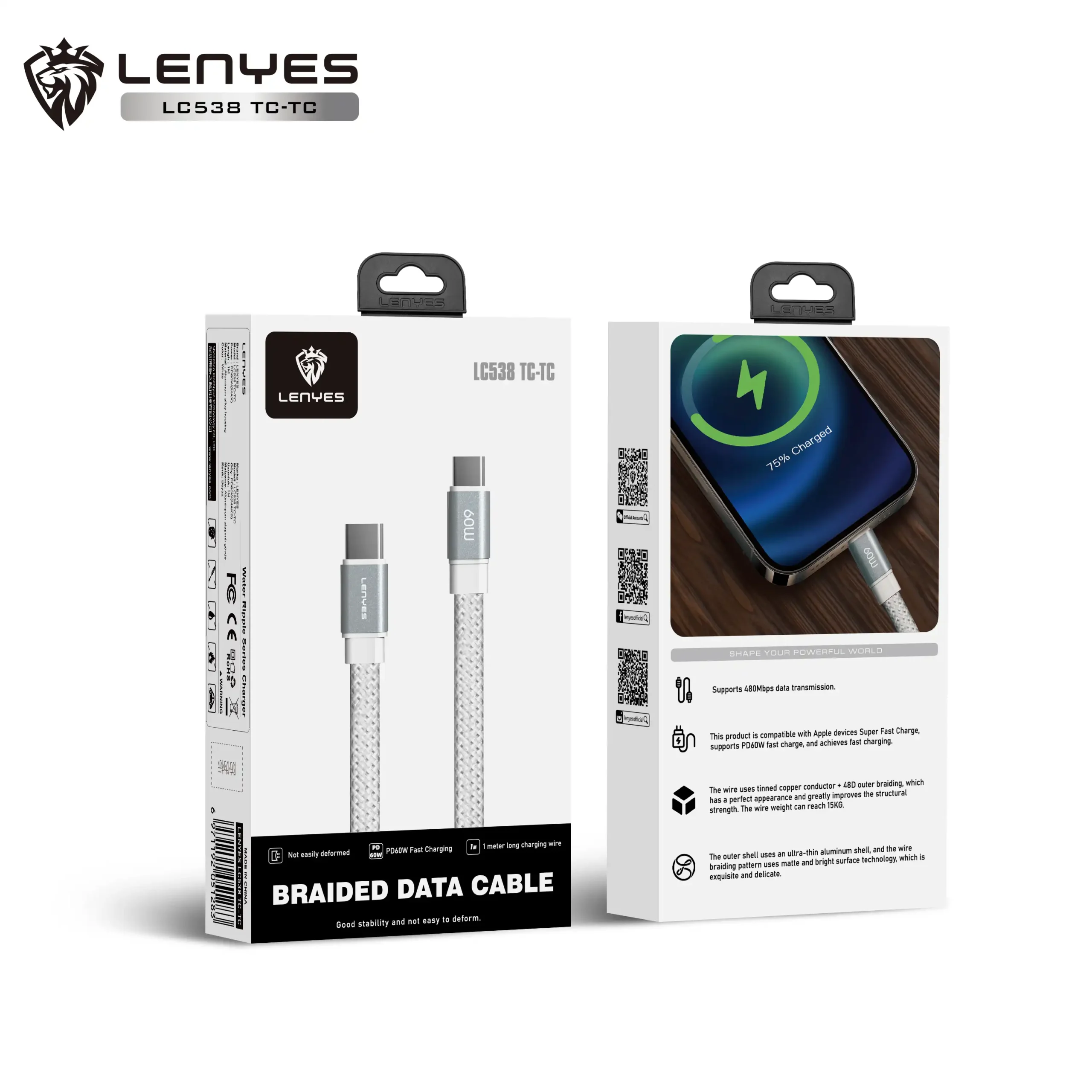 Lenyes LC538 TC-TC, Braided Data Cable, White