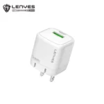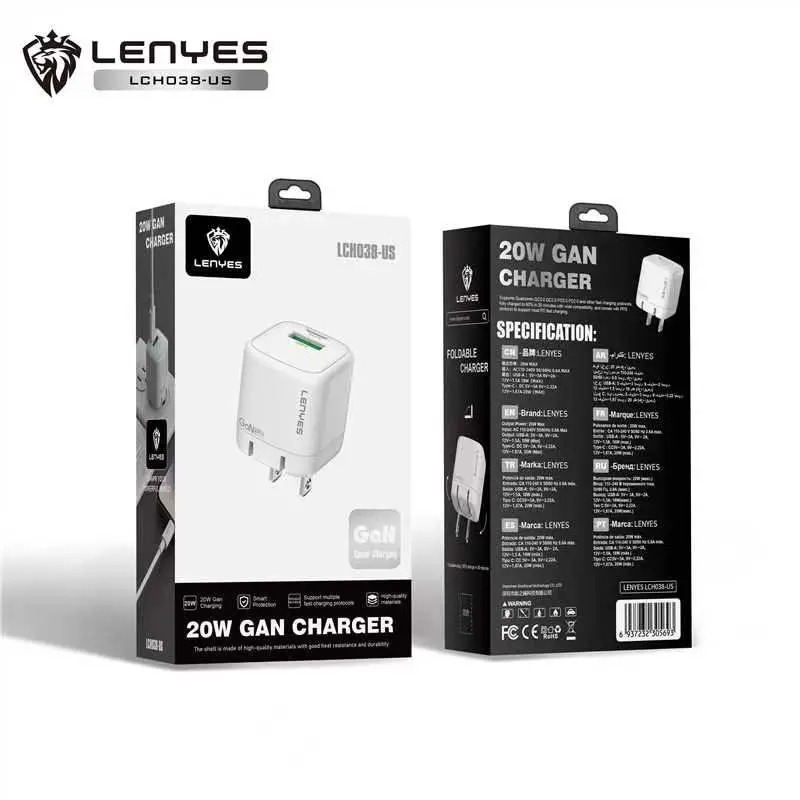 Mini 20W GaN Fast Wall Charger with 1 x USB A Output + 1 x USB C Output and foldable prongs for easy storage.