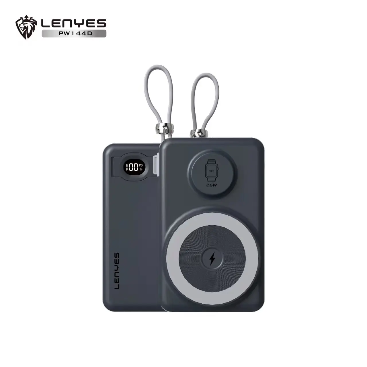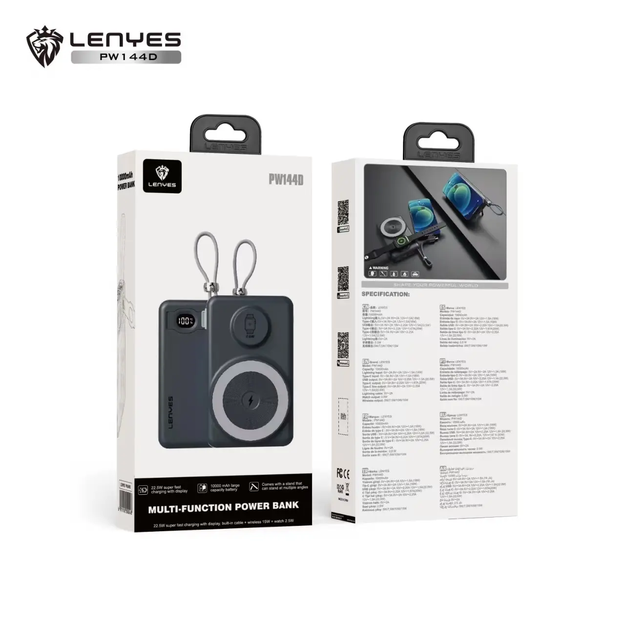 Super Slim MagSafe 10,000mAh Power Bank with built-in stand, builtd-in USB C & Lightning charging cable, digital power display, smartwatches magnetic charging, I x USB A output, 1 X USB A output, 1 x lightning input.