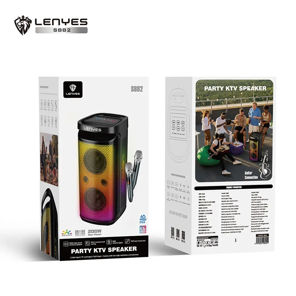 Features: This 200W TWS Karaoke Party Speaker with IPX4 Water Resistant rating, RGB lighting, TF card slot, 2 x wireless microphones, FM radio, remote control, USB A and AUX ports.